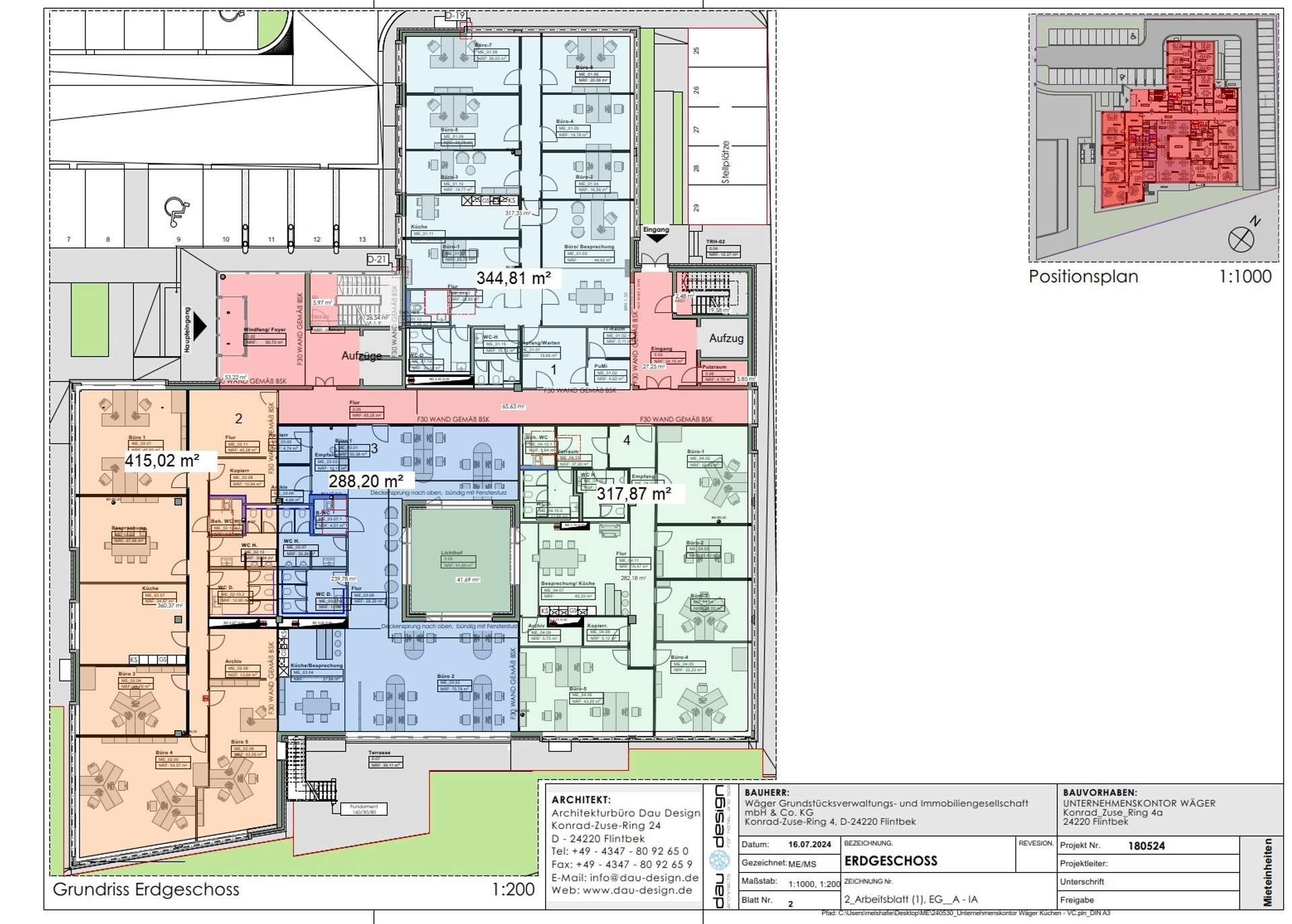 Erdgeschoß: insgesamt ca. 1.366 m², aufgeteilt in vier Einheiten mit 288 m² - 415 m²