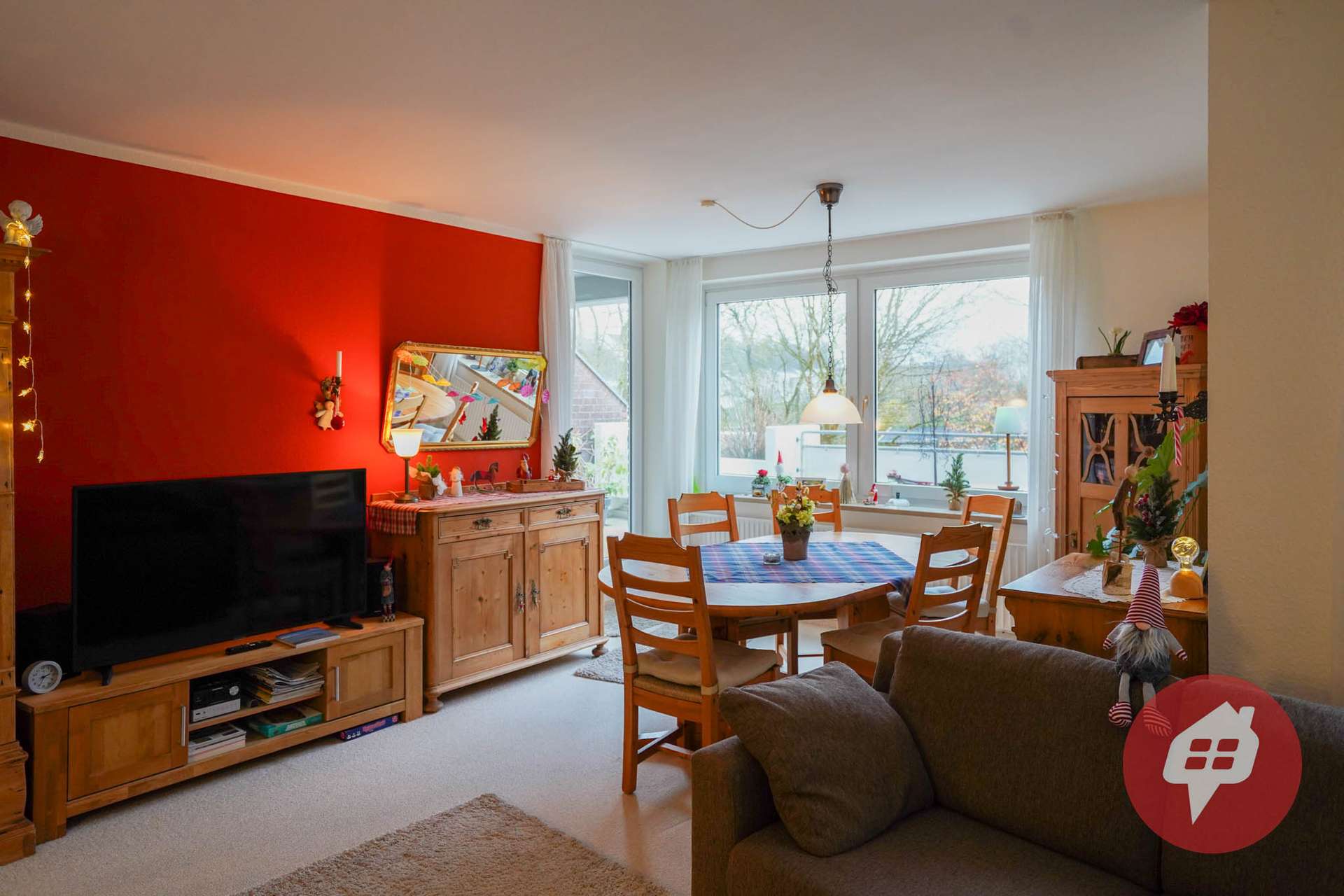 Das großzügige und helle Wohnzimmer bietet direkten Zugang zum großen, nach Süden ausgerichteten Balkon.