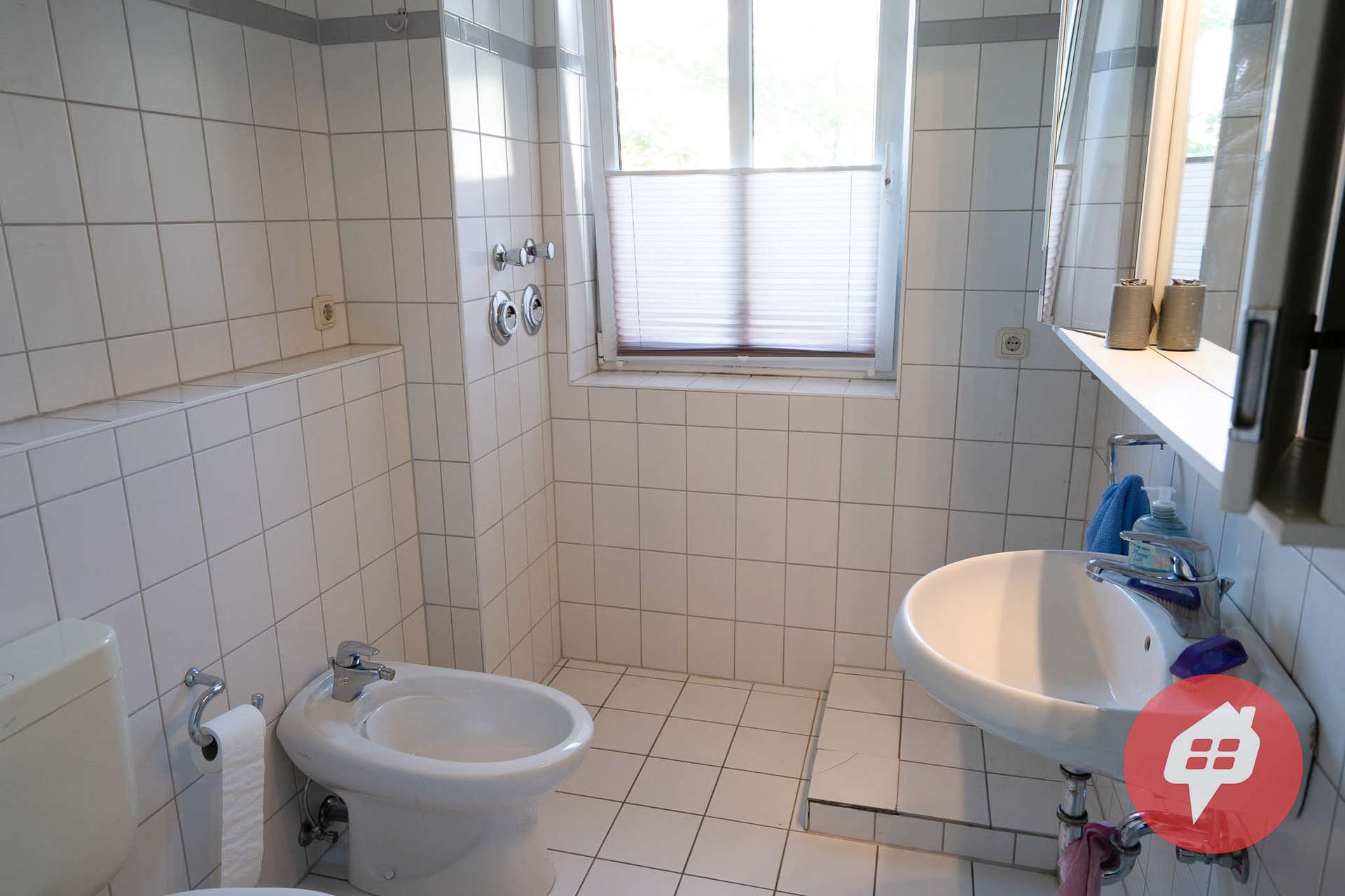 Das Badezimmer verfügt über eine Dusche, WC, Bidet, einen praktischen Waschmaschinenanschluss sowie ein Fenster.